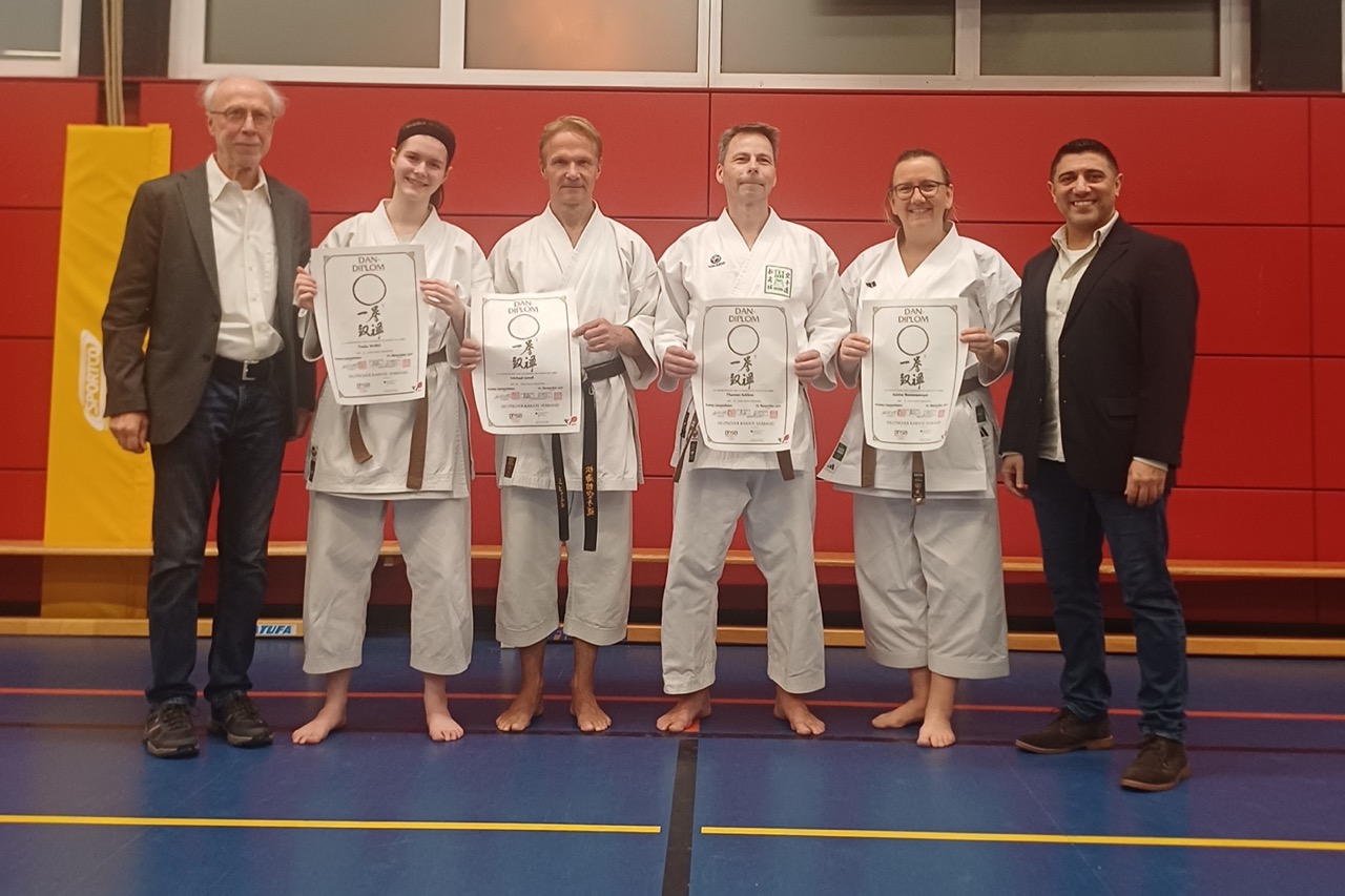 Im Anschluss an den Lehrgang stellten sich Paula, Sabine, Thorsten und Michael der Dan-Prüfung. Nach einer anspruchsvollen Prüfung, in der alle vier ihr Können vor den Prüfern Momo Abu Wahib und Reinhold Klasen zeigen konnten, erhielten Paula, Sabine und Thorsten ihre Diplome zum 1. Dan und Michael das Diplom zum zweiten Dan. Herzlichen Glückwunsch an unsere Dan-Träger!